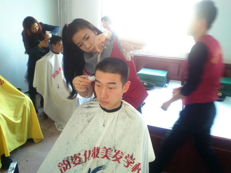 (韵姿美发学员为军人美发)